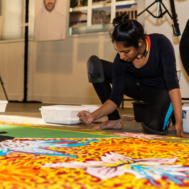 A collaborative exhibit showcasing MFA students from Emily Carr University of Art and Design, University of British Columbia, and Simon Fraser University in Vancouver, BC. The ephemeral sand carpet covered the floor of the gallery, inviting visitors to walk upon the piece in order to closely view the works of other artists. The patterns were inspired by Indian, Middle Eastern, and Portuguese rugs, placed in the context of the unceded territories of the First Nations Communities. Using the traditional technique of Rangoli, the work also spoke of endurance and cultural appropriation of carpets and its historical value.