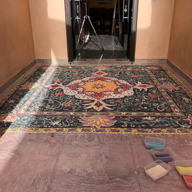 A simulacrum and appropriation of carpets created using dyed sand and inspirational patterns from Indian and Portuguese traditional rugs. The piece was exhibited as part of the summit between Qatar Museums and the New York Times, to discuss the future of art and culture in Berlin. The ephemeral concept of the rug discussed the sustainability of an art practice and metaphor for changing spaces and cultures.