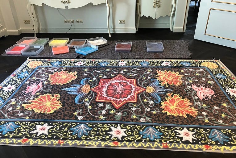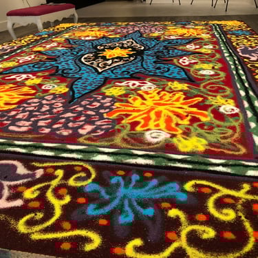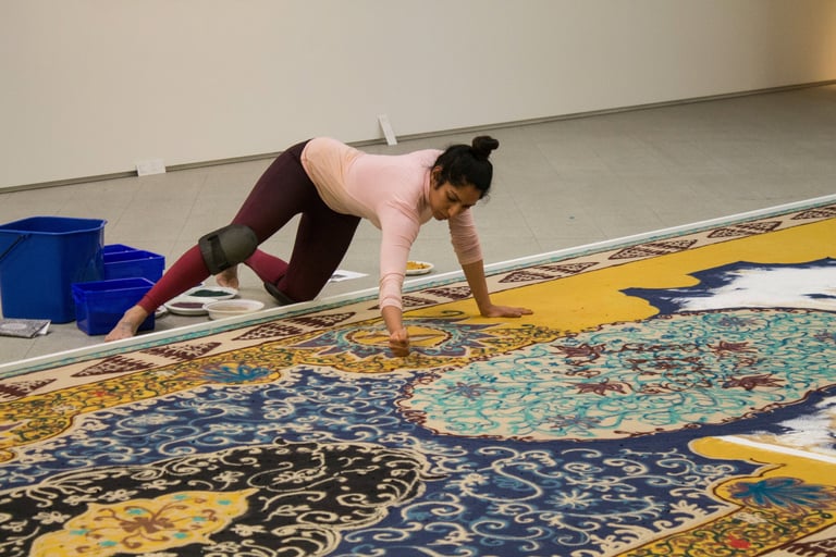 The ephemeral carpet influenced by the beautiful patterns of the Middle East, India, and Portugal is a reflection of my cultural heritage and incorporates the traditional technique of rangoli to apply the patterns of loose sand. People are invited to interact with the artwork by walking on the sand, which enhances the ephemeral nature of the piece. The patterns on the carpet are symbolic of the cultural shifts and changes experienced by people as they travel across the world. This impressive artwork captures the essence of cultural diversity and the ever-changing nature of our world.