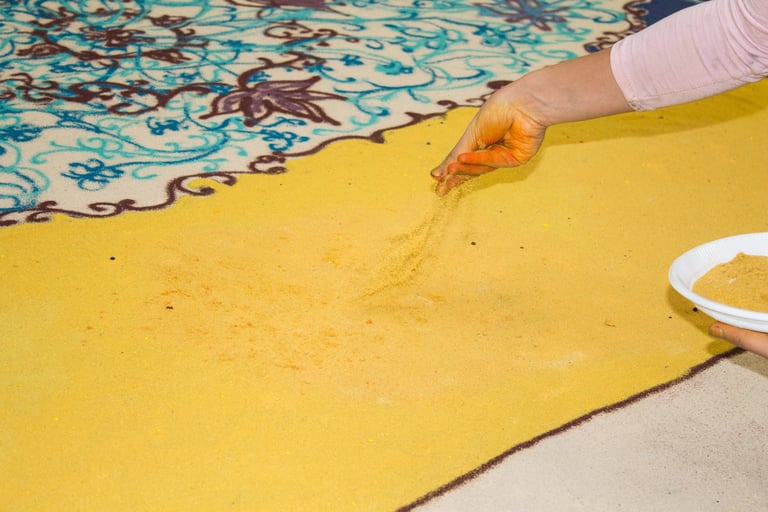 This ephemeral carpet draws inspiration from the patterns of the Middle East, India, and Portugal, reflecting the artist's cultural heritage. The traditional technique of rangoli was used to create the design, inviting viewers to physically interact with the loose sand. The impermanence and transformation of the patterns highlight the cultural shifts and impact experienced with travel. Additionally, mushrooms were incorporated into the design as a nod to the connectivity seen through mycelium networks in nature. With nature as the primary focus of the rug, it was important to emphasize the interconnectedness shared beneath the soil.